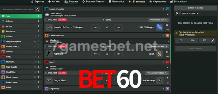 O Bet60 oferece uma grande seleção de opções de apostas em e-sports com probabilidades competitivas